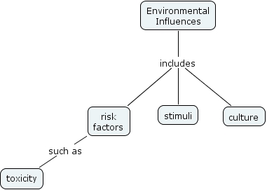 Environmental influences, Environmental Influences includes risk factors, Environmental Influences includes stimuli, risk factors such as toxicity, Environmental Influences includes culture