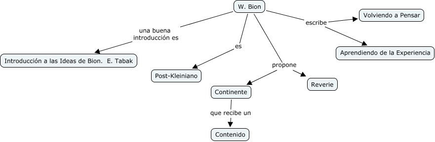 W. Bion, Continente que recibe un Contenido, W. Bion una buena introducción es Introducción a las Ideas de Bion. E. Tabak, W. Bion es Post-Kleiniano, W. Bion escribe Aprendiendo de la Experiencia, W. Bion escribe Volviendo a Pensar, W. Bion propone Reverie, W. Bion propone Continente