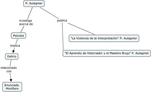 P. Aulagnier, P. Aulagnier publica "La Violencia de la Interpretación" P. Aulagnier, P. Aulagnier publica "El Aprendiz de Historiador y el Maestro Brujo" P. Aulagnier, Psicosis implica Delirio, P. Aulagnier investiga acerca de Psicosis, Delirio relacionado con Enunciado Mortífero