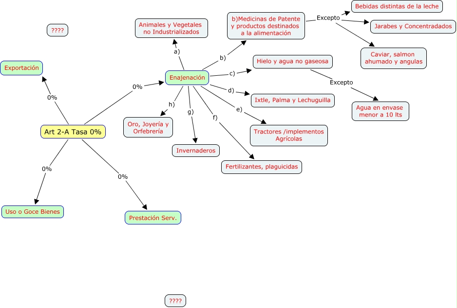 Art 2-A Grupal, Enajenación d) Ixtle, Palma y Lechuguilla, b)Medicinas de Patente y productos destinados a la alimentación Excepto Jarabes y Concentradados, Enajenación c) Hielo y agua no gaseosa, Art 2-A Tasa 0% 0% Prestación Serv., Art 2-A Tasa 0% 0% Enajenación, Art 2-A Tasa 0% 0% Exportación, Enajenación b) b)Medicinas de Patente y productos destinados a la alimentación, Enajenación h) Oro, Joyería y Orfebrería, b)Medicinas de Patente y productos destinados a la alimentación Excepto Caviar, salmon ahumado y angulas, Art 2-A Tasa 0% 0% Uso o Goce Bienes