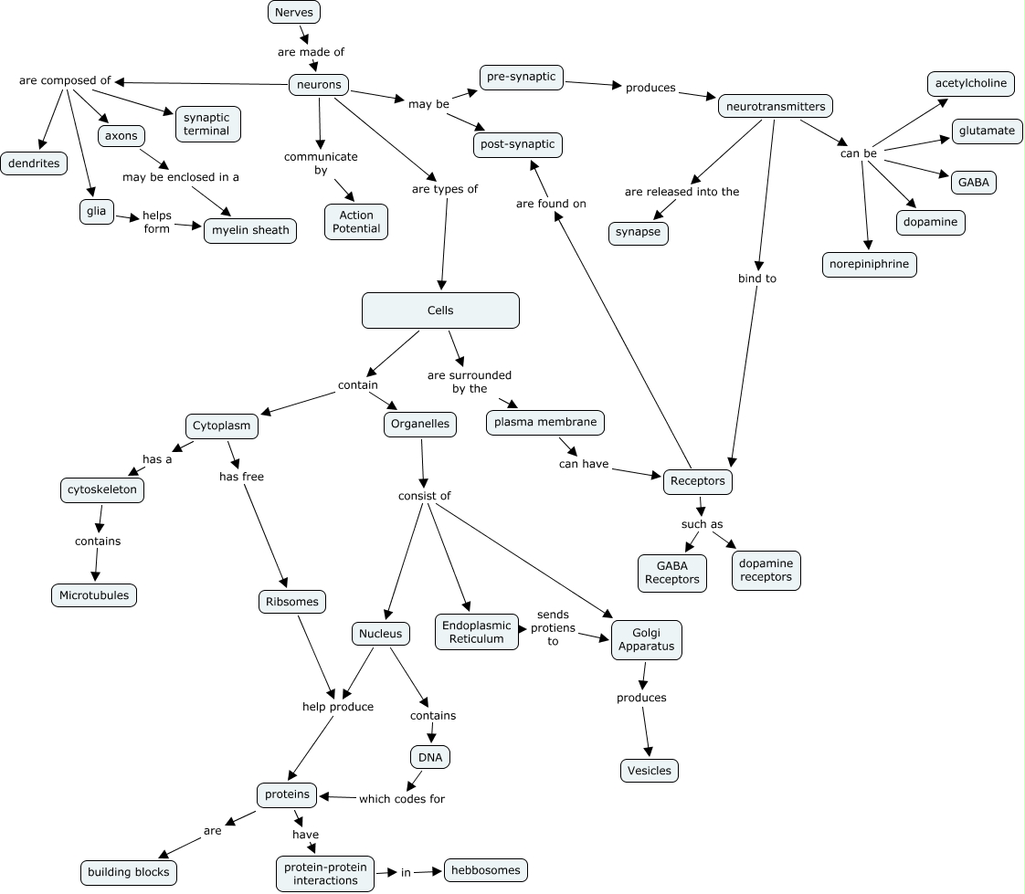 G-2 The cell_Caren, Receptors such as dopamine receptors, protein-protein interactions in hebbosomes, axons may be enclosed in a myelin sheath, Receptors are found on post-synaptic, Endoplasmic Reticulum sends protiens to Golgi Apparatus, Cytoplasm has a cytoskeleton, pre-synaptic produces neurotransmitters, Organelles consist of Endoplasmic Reticulum, Cells are surrounded by the plasma membrane, glia helps form myelin sheath
