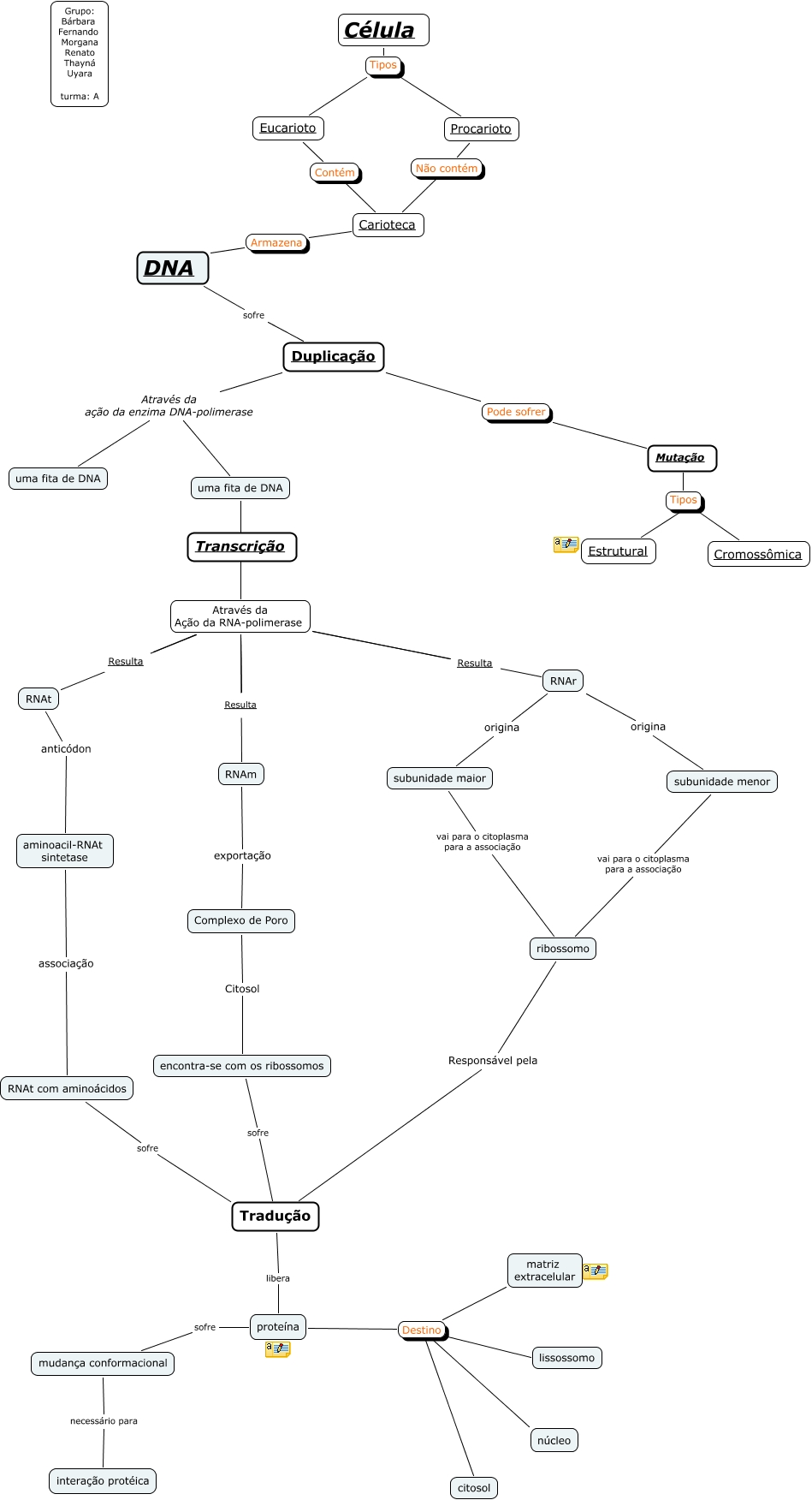 Mapa Conceitual - grupo2 - thayna fernando barbara renato morgana uyara, Estrutural Tipos Cromossômica, Eucarioto Contém Carioteca, RNAr origina subunidade maior, subunidade maior vai para o citoplasma para a associação ribossomo, Duplicação Através da ação da enzima DNA-polimerase uma fita de DNA, mudança conformacional necessário para interação protéica, RNAr origina subunidade menor, DNA sofre Duplicação, uma fita de DNA Através da Ação da RNA-polimerase RNAt, Célula Tipos Eucarioto