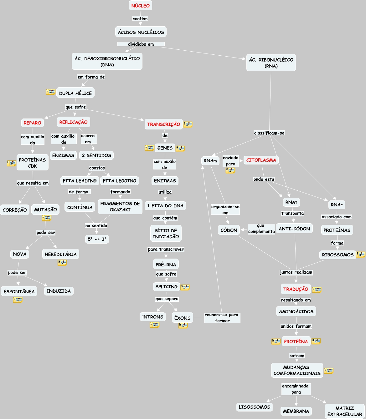 GRUPO 89, TRADUÇÃO resultando em AMINOÁCIDOS, PROTEÍNA sofrem MUDANÇAS COMFORMACIONAIS, CITOPLASMA onde esta RNAr, MUDANÇAS COMFORMACIONAIS encaminhada para MATRIZ EXTRACELULAR, MUDANÇAS COMFORMACIONAIS encaminhada para MEMBRANA, ÁC. RIBONUCLÉICO (RNA) classificam-se RNAt, SPLICING que separa íNTRONS, AMINOÁCIDOS unidos formam PROTEÍNA, REPARO com auxilio da PROTEÍNAS CDK, DUPLA HÉLICE que sofre REPARO
