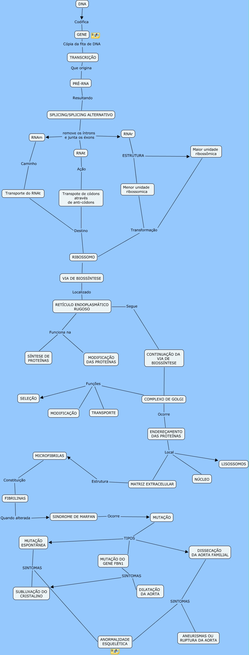 glaucio, SINDROME DE MARFAN Ocorre MUTAÇÃO, RNAt Ação Transpote de códons através de anti-códons, RIBOSSOMO VIA DE BIOSSÍNTESE, MUTAÇÃO ESPONTÂNEA SINTOMAS SUBLUXAÇÃO DO CRISTALINO, MATRIZ EXTRACELULAR Estrutura MICROFIBRILAS, ENDEREÇAMENTO DAS PROTEÍNAS Local LISOSSOMOS, MUTAÇÃO ESPONTÂNEA SINTOMAS ANORMALIDADE ESQUELÉTICA, MUTAÇÃO TIPOS MUTAÇÃO DO GENE FBN1, RNAm Caminho Transporte do RNAt, Transpote de códons através de anti-códons Destino RIBOSSOMO
