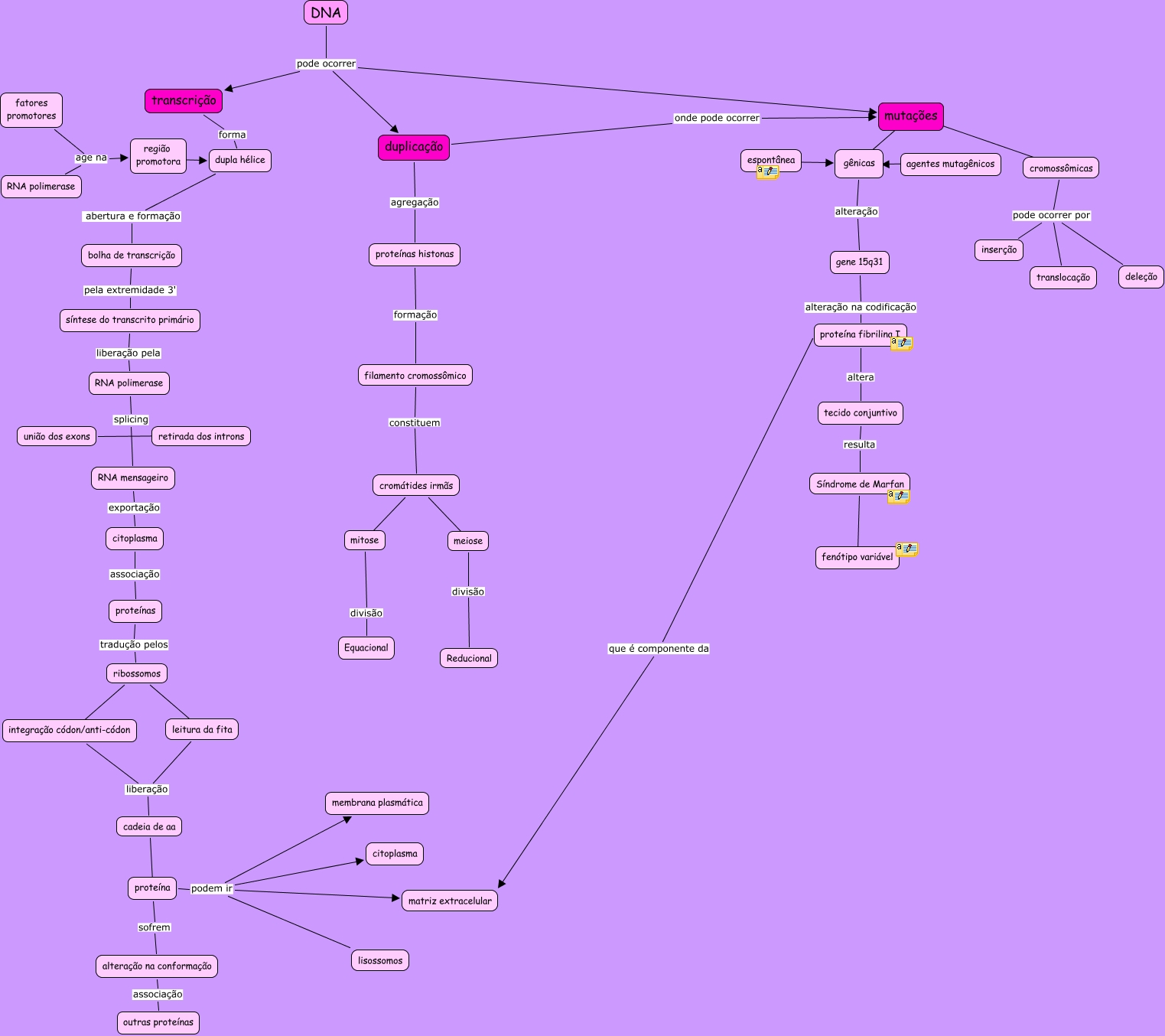 Julia, Lia, Luana, Mariana M, Marina e Pedro, proteína podem ir citoplasma, integração códon/anti-códon liberação cadeia de aa, DNA pode ocorrer transcrição, proteína fibrilina I que é componente da matriz extracelular, cadeia de aa ???? proteína, cromossômicas pode ocorrer por translocação, mutações ???? gênicas, DNA pode ocorrer duplicação, proteína sofrem alteração na conformação, mitose divisão Equacional