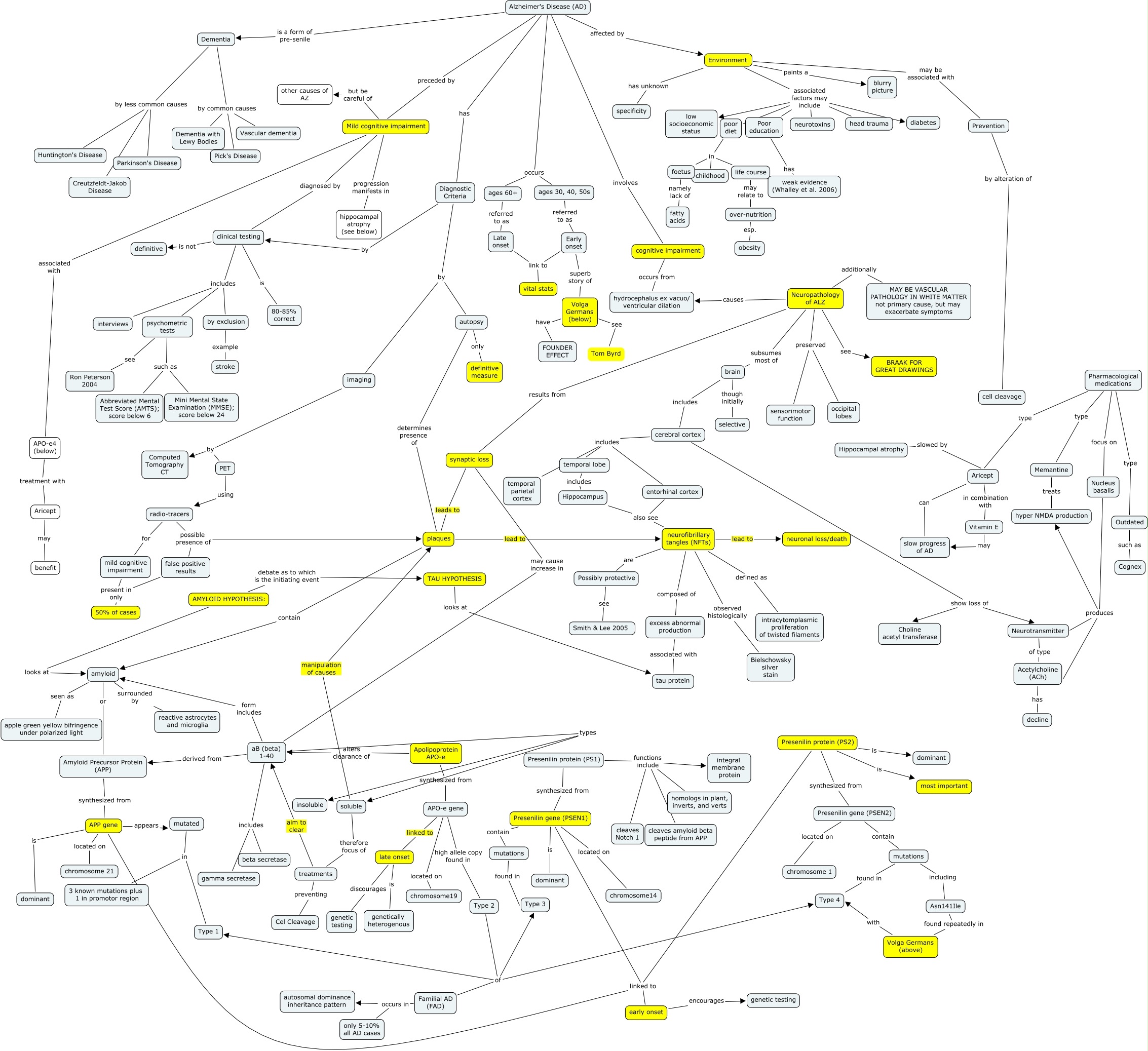 ALZ FINAL, Outdated such as Cognex, AMYLOID HYPOTHESIS: debate as to which is the initiating event TAU HYPOTHESIS, cerebral cortex includes temporal lobe, Presenilin gene (PSEN1) is dominant, Type 2 of Familial AD (FAD), soluble manipulation of causes plaques, Presenilin gene (PSEN1) linked to early onset, Pharmacological medications type Memantine, amyloid seen as apple green yellow bifringence under polarized light, by exclusion example stroke