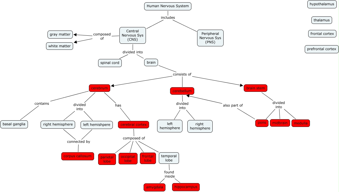 Human Nervous System, Central Nervous Sys (CNS) divided into spinal cord, cerebral cortex composed of temporal lobe, cerebrum contains basal ganglia, cerebral cortex composed of parietal lobe, temporal lobe found inside hippocampus, cerebrum divided into right hemisphere, cerebellum divided into left hemisphere, brain consists of cerebellum, temporal lobe found inside amygdala, Central Nervous Sys (CNS) composed of gray matter