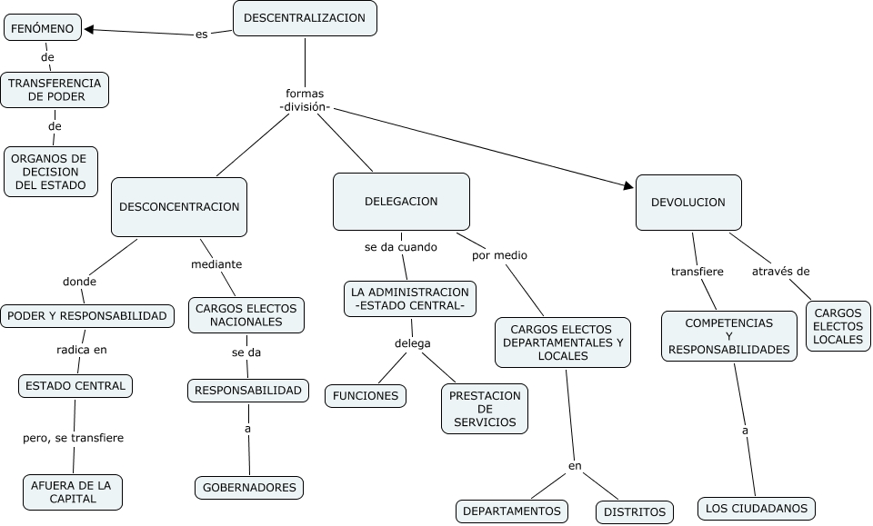 JULIANRUIZ DESCENTRALIZACION, PODER Y RESPONSABILIDAD radica en ESTADO CENTRAL, LA ADMINISTRACION -ESTADO CENTRAL- delega FUNCIONES, DEVOLUCION através de CARGOS ELECTOS LOCALES, DESCENTRALIZACION formas -división- DELEGACION, TRANSFERENCIA DE PODER de ORGANOS DE DECISION DEL ESTADO, COMPETENCIAS Y RESPONSABILIDADES a LOS CIUDADANOS, DESCENTRALIZACION formas -división- DESCONCENTRACION, DESCENTRALIZACION formas -división- DEVOLUCION, DELEGACION se da cuando LA ADMINISTRACION -ESTADO CENTRAL-, ESTADO CENTRAL pero, se transfiere AFUERA DE LA CAPITAL