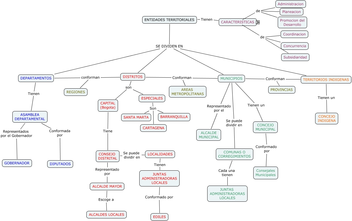Entidades Territoriales, Autonomia de Planeacion, ENTIDADES TERRITORIALES Tienen CARACTERISTICAS, CONSEJO DISTRITAL Representado por ALCALDE MAYOR, Principios de Coordinacion, DISTRITOS Conforman AREAS METROPOLITANAS, CAPITAL (Bogota) Tiene CONSEJO DISTRITAL, DISTRITOS Conforman MUNICIPIOS, ESPECIALES Son SANTA MARTA, DEPARTAMENTOS conforman DISTRITOS, LOCALIDADES Tienen JUNTAS ADMINISTRADORAS LOCALES