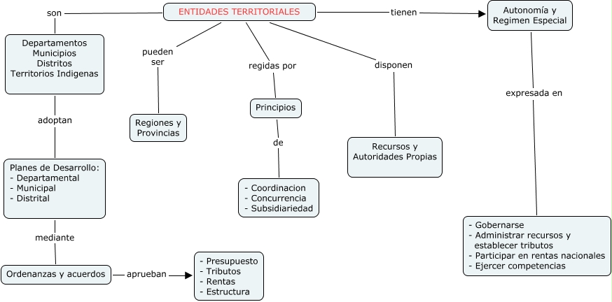 EETT Nidia Riveros, ENTIDADES TERRITORIALES tienen Autonomía y Regimen Especial, ENTIDADES TERRITORIALES regidas por Principios, Autonomía y Regimen Especial expresada en - Gobernarse - Administrar recursos y establecer tributos - Participar en rentas nacionales - Ejercer competencias, ENTIDADES TERRITORIALES son Departamentos Municipios Distritos Territorios Indigenas, Principios de - Coordinacion - Concurrencia - Subsidiariedad, ENTIDADES TERRITORIALES pueden ser Regiones y Provincias, ENTIDADES TERRITORIALES disponen Recursos y Autoridades Propias, Planes de Desarrollo: - Departamental - Municipal - Distrital mediante Ordenanzas y acuerdos, Departamentos Municipios Distritos Territorios Indigenas adoptan Planes de Desarrollo: - Departamental - Municipal - Distrital, Ordenanzas y acuerdos aprueban - Presupuesto - Tributos - Rentas - Estructura