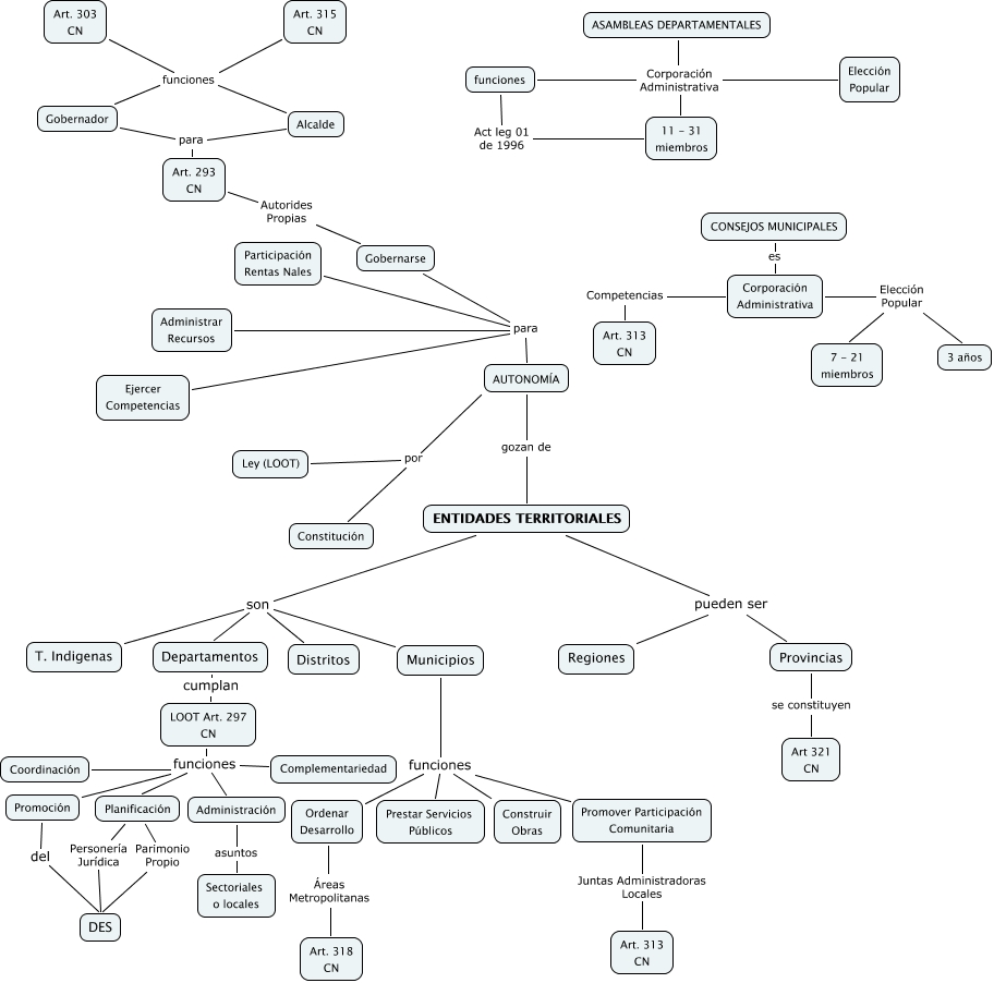 Andrea Moreno Régimen Constitucional Entidades Territoriales, AUTONOMÍA por Ley (LOOT), ASAMBLEAS DEPARTAMENTALES Corporación Administrativa 11 - 31 miembros, ENTIDADES TERRITORIALES gozan de AUTONOMÍA, Corporación Administrativa Competencias Art. 313 CN, Art. 293 CN para Alcalde, LOOT Art. 297 CN funciones Promoción, Planificación Personería Jurídica DES, LOOT Art. 297 CN funciones Coordinación, Gobernarse Autorides Propias Art. 293 CN, Municipios funciones Construir Obras