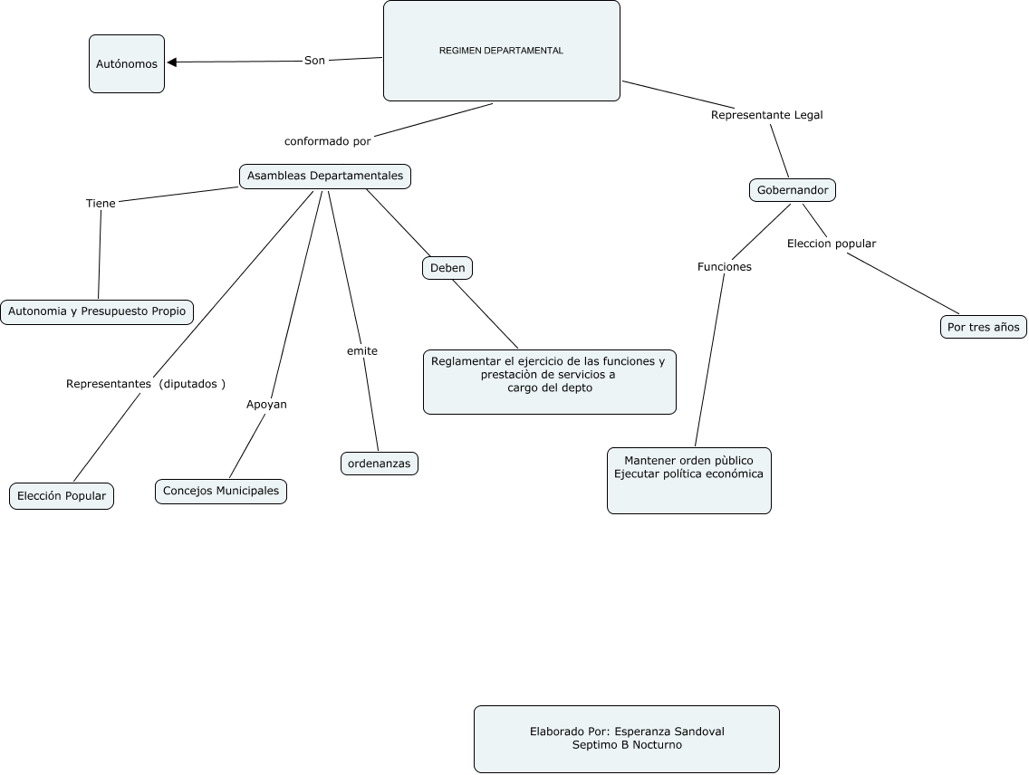 Reg. Dptal Esperanza Sandoval, REGIMEN DEPARTAMENTAL conformado por Reglamentar el ejercicio de las funciones y prestaciòn de servicios a cargo del depto, REGIMEN DEPARTAMENTAL Son Autónomos, Gobernandor Funciones Mantener orden pùblico Ejecutar política económica, Asambleas Departamentales Representantes (diputados ) Elección Popular, Gobernandor Eleccion popular Por tres años, Asambleas Departamentales emite ordenanzas, Asambleas Departamentales Apoyan Concejos Municipales, REGIMEN DEPARTAMENTAL Representante Legal Gobernandor, Asambleas Departamentales Tiene Autonomia y Presupuesto Propio