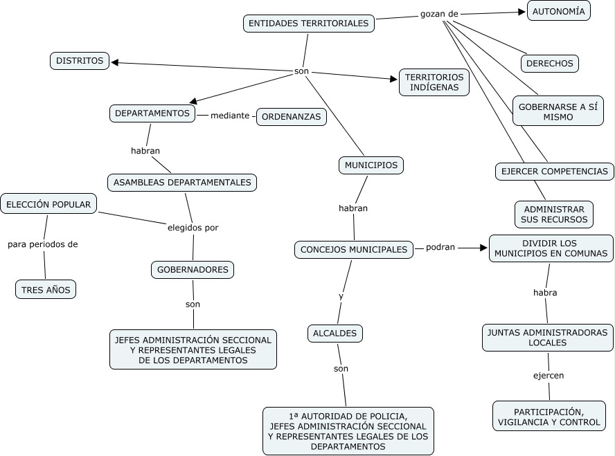 ENTIDADES TERRITORIALES.Patricia Onatra, ENTIDADES TERRITORIALES son TERRITORIOS INDÍGENAS, DEPARTAMENTOS mediante ORDENANZAS, ELECCIÓN POPULAR para periodos de TRES AÑOS, DERECHOS gozan de ADMINISTRAR SUS RECURSOS, ENTIDADES TERRITORIALES son MUNICIPIOS, ASAMBLEAS DEPARTAMENTALES elegidos por GOBERNADORES, JUNTAS ADMINISTRADORAS LOCALES ejercen PARTICIPACIÓN, VIGILANCIA Y CONTROL, MUNICIPIOS habran CONCEJOS MUNICIPALES, DERECHOS gozan de GOBERNARSE A SÍ MISMO, DIVIDIR LOS MUNICIPIOS EN COMUNAS habra JUNTAS ADMINISTRADORAS LOCALES