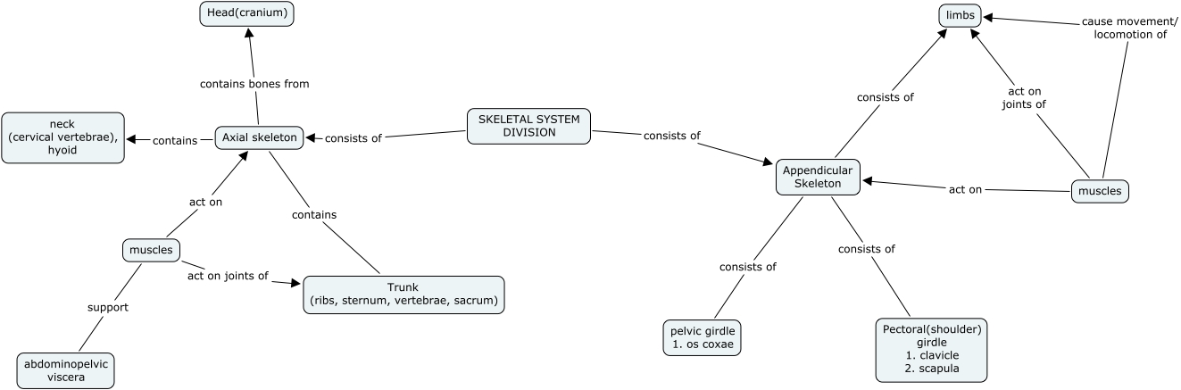 This Concept Map, created with IHMC CmapTools, has information related to: Division of skeletal system, muscles cause movement/ locomotion of limbs, SKELETAL SYSTEM DIVISION consists of Appendicular Skeleton, Axial skeleton contains neck (cervical vertebrae), hyoid, Appendicular Skeleton consists of limbs, Appendicular Skeleton consists of Pectoral(shoulder) girdle 1. clavicle 2. scapula, muscles act on Appendicular Skeleton, muscles support abdominopelvic viscera, Appendicular Skeleton consists of pelvic girdle 1. os coxae, muscles act on Axial skeleton, Axial skeleton contains Trunk (ribs, sternum, vertebrae, sacrum), SKELETAL SYSTEM DIVISION consists of Axial skeleton, muscles act on joints of limbs, muscles act on joints of Trunk (ribs, sternum, vertebrae, sacrum), Axial skeleton contains bones from Head(cranium)