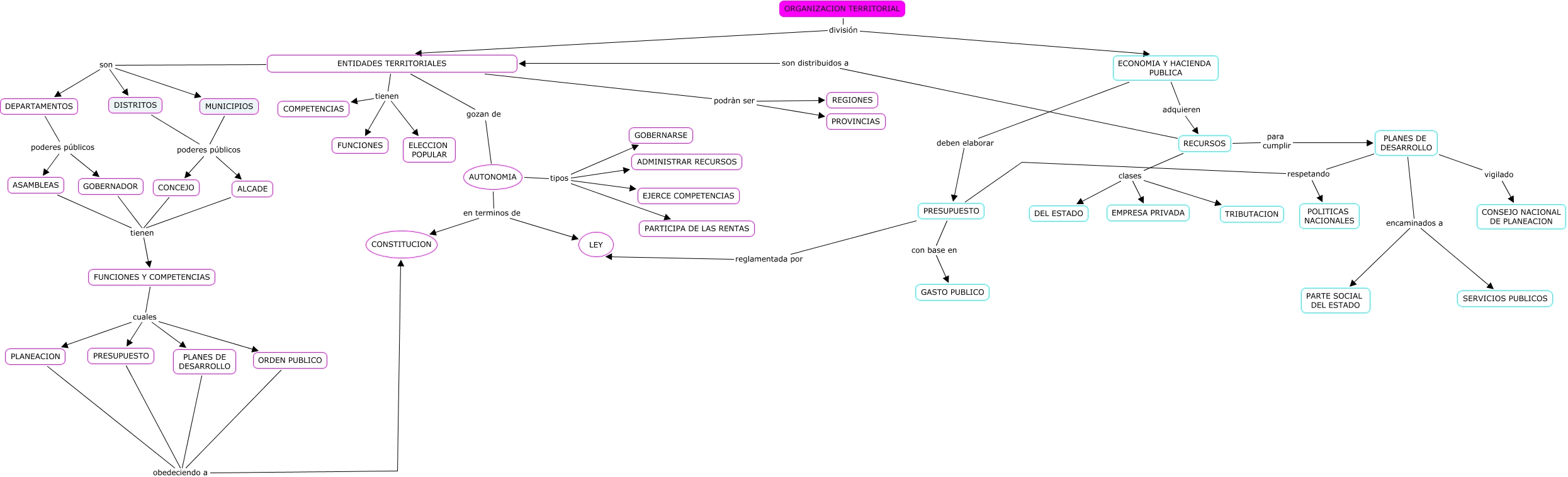 ORGANIZACION TERRITORIAL LEONARDO ORTIZ 08482, MUNICIPIOS poderes públicos CONCEJO, ECONOMIA Y HACIENDA PUBLICA deben elaborar PRESUPUESTO, PLANES DE DESARROLLO obedeciendo a CONSTITUCION, RECURSOS clases EMPRESA PRIVADA, AUTONOMIA en terminos de LEY, AUTONOMIA en terminos de CONSTITUCION, ENTIDADES TERRITORIALES gozan de AUTONOMIA, ENTIDADES TERRITORIALES son DISTRITOS, MUNICIPIOS poderes públicos ALCADE, ENTIDADES TERRITORIALES podràn ser REGIONES