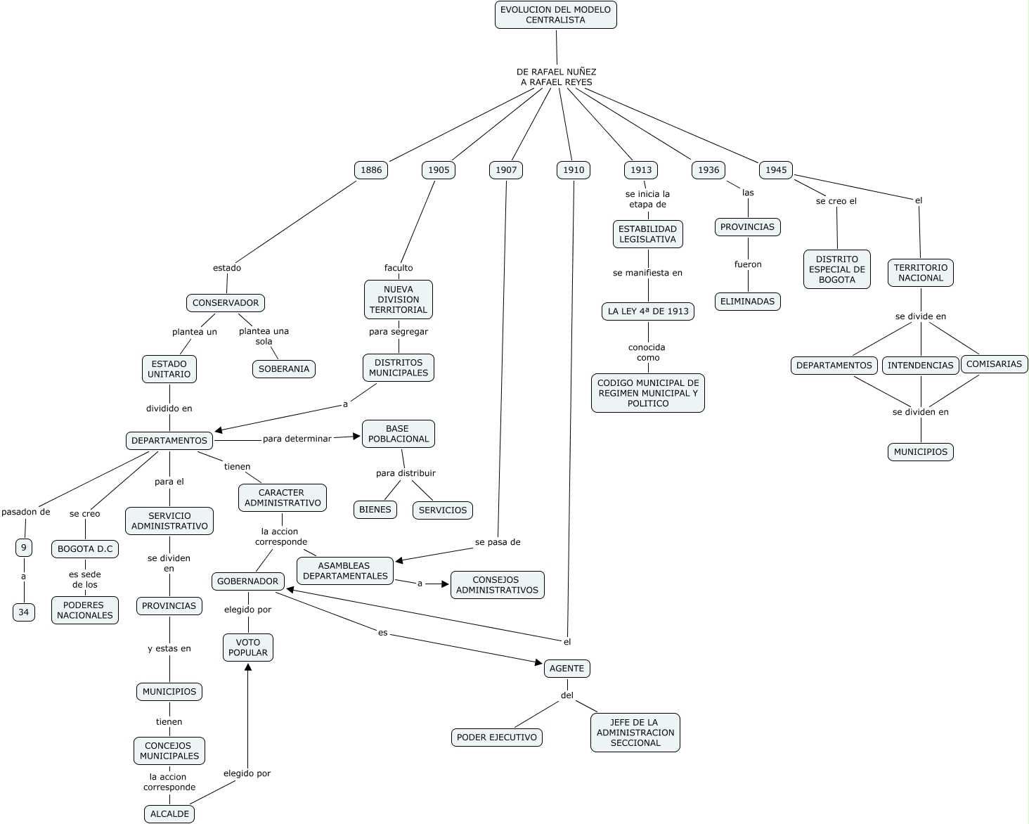 Capitulo2, MUNICIPIOS tienen CONCEJOS MUNICIPALES, DEPARTAMENTOS tienen CARACTER ADMINISTRATIVO, CARACTER ADMINISTRATIVO la accion corresponde ASAMBLEAS DEPARTAMENTALES, ALCALDE elegido por VOTO POPULAR, 1936 las PROVINCIAS, INTENDENCIAS se dividen en DEPARTAMENTOS, 1907 se pasa de ASAMBLEAS DEPARTAMENTALES, GOBERNADOR elegido por VOTO POPULAR, ESTADO UNITARIO dividido en DEPARTAMENTOS, BASE POBLACIONAL para distribuir SERVICIOS