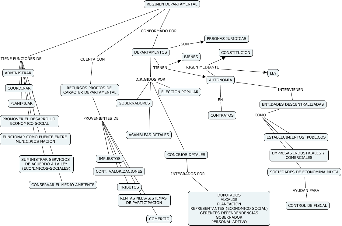REGIMEN DEPARTAMENTAL, RECURSOS PROPIOS DE CARACTER DEPARTAMENTAL PROVENIENTES DE IMPUESTOS, ENTIDADES DESCENTRALIZADAS COMO EMPRESAS INDUSTRIALES Y COMERCIALES, AUTONOMIA RIGEN MEDIANTE LEY, REGIMEN DEPARTAMENTAL TIENE FUNCIONES DE PROMOVER EL DESARROLLO ECONOMICO SOCIAL, REGIMEN DEPARTAMENTAL TIENE FUNCIONES DE CONSERVAR EL MEDIO AMBIENTE, DEPARTAMENTOS TIENEN AUTONOMIA, AUTONOMIA EN CONTRATOS, DEPARTAMENTOS DIRIGIDOS POR CONCEJOS DPTALES, REGIMEN DEPARTAMENTAL TIENE FUNCIONES DE SUMINISTRAR SERVICIOS DE ACUERDO A LA LEY (ECONIMICOS-SOCIALES), REGIMEN DEPARTAMENTAL TIENE FUNCIONES DE FUNCIONAR COMO PUENTE ENTRE MUNICIPIOS NACION