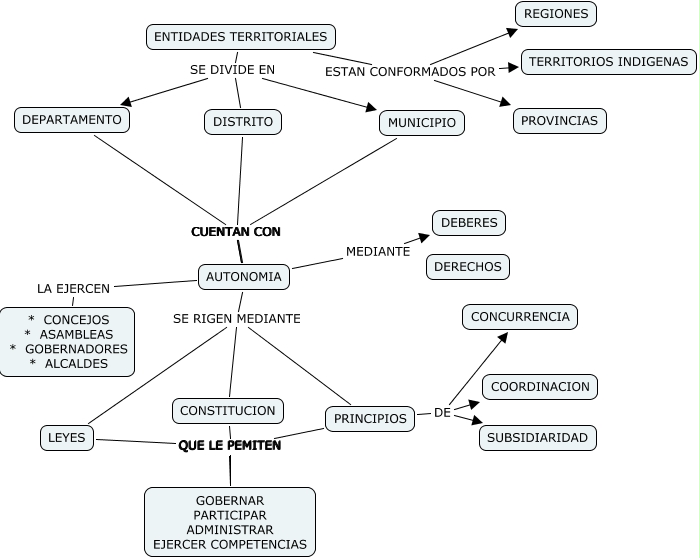 ENTIDADES TERRITORIALES, PRINCIPIOS DE SUBSIDIARIDAD, AUTONOMIA SE RIGEN MEDIANTE PRINCIPIOS, AUTONOMIA MEDIANTE DEBERES, PRINCIPIOS QUE LE PEMITEN GOBERNAR PARTICIPAR ADMINISTRAR EJERCER COMPETENCIAS, LEYES QUE LE PEMITEN GOBERNAR PARTICIPAR ADMINISTRAR EJERCER COMPETENCIAS, ENTIDADES TERRITORIALES ESTAN CONFORMADOS POR PROVINCIAS, ENTIDADES TERRITORIALES SE DIVIDE EN MUNICIPIO, MUNICIPIO CUENTAN CON AUTONOMIA, AUTONOMIA SE RIGEN MEDIANTE LEYES, ENTIDADES TERRITORIALES ESTAN CONFORMADOS POR REGIONES