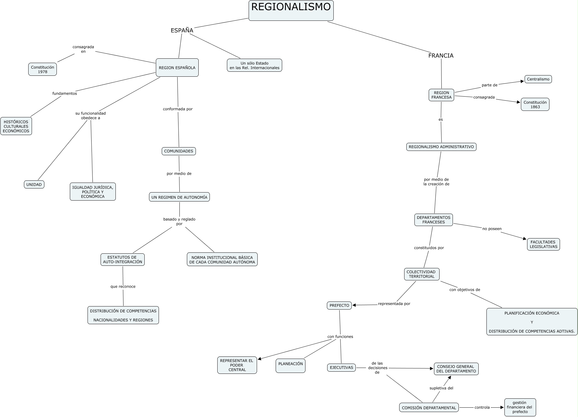 REGION FRANCIA Y ESPAÑA, REGION ESPAÑOLA consagrada en Constitución 1978, COLECTIVIDAD TERRITORIAL con objetivos de PLANIFICACIÓN ECONÓMICA Y DISTRIBUCIÓN DE COMPETENCIAS ADTIVAS., UN REGIMEN DE AUTONOMÍA basado y reglado por ESTATUTOS DE AUTO-INTEGRACIÓN, REGIONALISMO FRANCIA REGION FRANCESA, REGION FRANCESA consagrada Constitución 1863, PREFECTO con funciones REPRESENTAR EL PODER CENTRAL, REGION ESPAÑOLA fundamentos HISTÓRICOS CULTURALES ECONÓMICOS, REGIONALISMO ESPAÑA Un sólo Estado en las Rel. Internacionales, EJECUTIVAS de las decisiones de COMISIÓN DEPARTAMENTAL, REGION ESPAÑOLA su funcionalidad obedece a UNIDAD