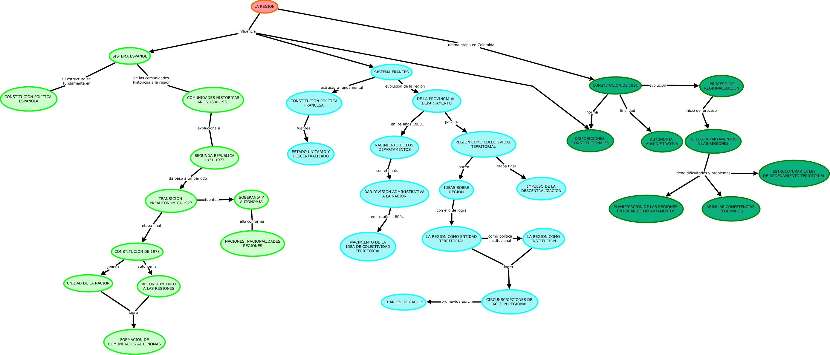 LA REGION PARTE 2 LEONARDO ORTIZ 08482, COMUNIDADES HISTORICAS AÑOS 1800-1931 evoluciona a SEGUNDA REPUBLICA 1931-1977, PROCESO DE REGIONALIZACION inicio del proceso DE LOS DEPARTAMENTOS A LAS REGIONES, SISTEMA FRANCES estructura fundamental CONSTITUCION POLITICA FRANCESA, REGION COMO COLECTIVIDAD TERRITORIAL etapa final IMPULSO DE LA DESCENTRALIZACION, SEGUNDA REPUBLICA 1931-1977 da paso a un periodo TRANSICION PREAUTONOMICA 1977, CONSTITUCION DE 1978 autonomia RECONOCIMIENTO A LAS REGIONES, LA REGION ultima etapa en Colombia CONSTITUCION DE 1991, DE LOS DEPARTAMENTOS A LAS REGIONES tiene dificultades y problemas ESTRUCUTURAR LA LEY DE ORDENAMIENTO TERRITORIAL, LA REGION influencia SISTEMA FRANCES, RECONOCIMIENTO A LAS REGIONES logro FORMACION DE COMUNIDADES AUTONOMAS