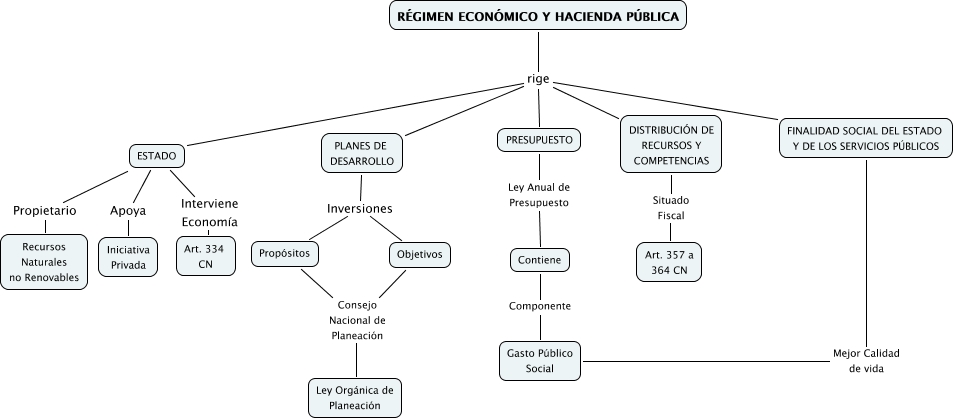 Andrea Moreno Régimen Económico y Hacienda Pública, ESTADO Apoya Iniciativa Privada, DISTRIBUCIÓN DE RECURSOS Y COMPETENCIAS Situado Fiscal Art. 357 a 364 CN, RÉGIMEN ECONÓMICO Y HACIENDA PÚBLICA rige ESTADO, PLANES DE DESARROLLO Inversiones Propósitos, RÉGIMEN ECONÓMICO Y HACIENDA PÚBLICA rige DISTRIBUCIÓN DE RECURSOS Y COMPETENCIAS, PLANES DE DESARROLLO Inversiones Objetivos, FINALIDAD SOCIAL DEL ESTADO Y DE LOS SERVICIOS PÚBLICOS Mejor Calidad de vida Gasto Público Social, Objetivos Consejo Nacional de Planeación Ley Orgánica de Planeación, Propósitos Consejo Nacional de Planeación Ley Orgánica de Planeación, ESTADO Interviene Economía Art. 334 CN