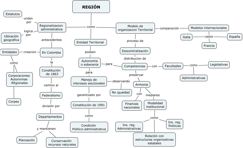 REGION Diana Mora G, Constitución de 1991 como Condición Politico-administrativa, Modelo de organizacion Territorial como Entidad Territorial, Entidades como Corpes, Entidad Territorial poseen Autonomia o soberania, Ins. reg. Administrativas como Relación con estructuras organizativas estatales, Manejo de intereses seccionales garantizado por Constitución de 1991, Modelos internacionales casos Francia, Italia casos Francia, Federalismo división por Departamentos, Regionalizacion administrativa antecedentes En Colombia