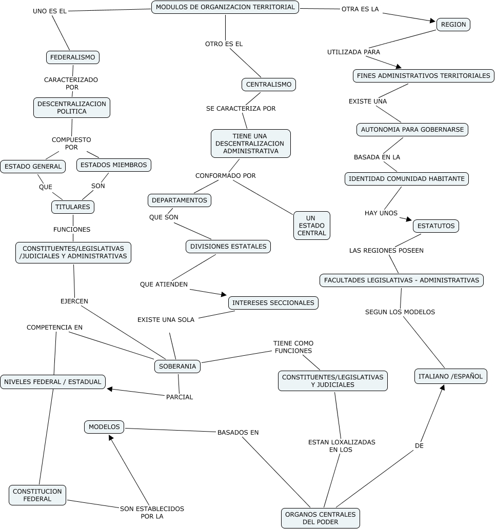 MODELOS ESTATALES DE ORGANIZACION TERRITORIAL, CONSTITUCION FEDERAL SON ESTABLECIDOS POR LA MODELOS, ESTADOS MIEMBROS SON TITULARES, FEDERALISMO CARACTERIZADO POR DESCENTRALIZACION POLITICA, CONSTITUENTES/LEGISLATIVAS Y JUDICIALES ESTAN LOXALIZADAS EN LOS ORGANOS CENTRALES DEL PODER, IDENTIDAD COMUNIDAD HABITANTE HAY UNOS ESTATUTOS, TITULARES FUNCIONES CONSTITUENTES/LEGISLATIVAS /JUDICIALES Y ADMINISTRATIVAS, MODELOS BASADOS EN ORGANOS CENTRALES DEL PODER, ESTADO GENERAL QUE TITULARES, SOBERANIA COMPETENCIA EN CONSTITUCION FEDERAL, AUTONOMIA PARA GOBERNARSE BASADA EN LA IDENTIDAD COMUNIDAD HABITANTE