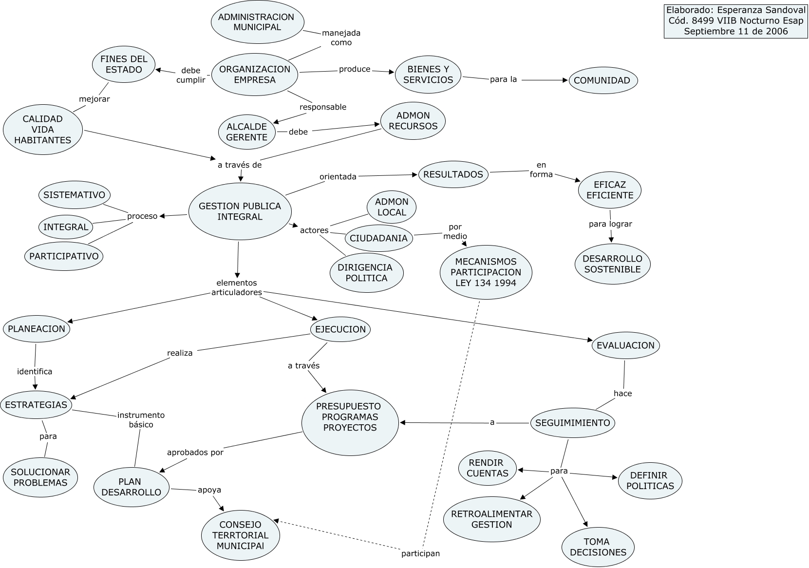 ADMINISTRACION MUNICIPAL, EFICAZ EFICIENTE para lograr DESARROLLO SOSTENIBLE, ALCALDE GERENTE debe ADMON RECURSOS, GESTION PUBLICA INTEGRAL actores DIRIGENCIA POLITICA, CALIDAD VIDA HABITANTES a través de GESTION PUBLICA INTEGRAL, MECANISMOS PARTICIPACION LEY 134 1994 participan CONSEJO TERRTORIAL MUNICIPAl, ORGANIZACION EMPRESA produce BIENES Y SERVICIOS, PLAN DESARROLLO apoya CONSEJO TERRTORIAL MUNICIPAl, GESTION PUBLICA INTEGRAL orientada RESULTADOS, GESTION PUBLICA INTEGRAL proceso INTEGRAL, ADMON RECURSOS a través de GESTION PUBLICA INTEGRAL