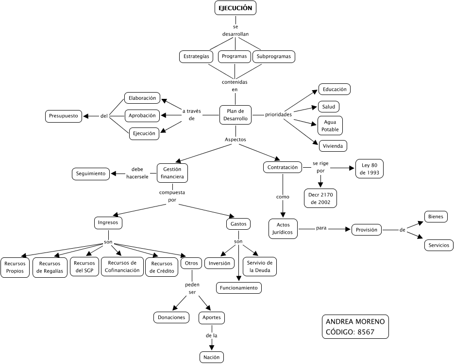 EJECUCIÓN, ANDREA MORENO, Gestión financiera debe hacersele Seguimiento, Plan de Desarrollo a través de Ejecución, Plan de Desarrollo Aspectos Gestión financiera, Gastos son Inversión, Ingresos son Recursos de Regalías, Gastos son Servivio de la Deuda, EJECUCIÓN se desarrollan Estrategías, Contratación se rige por Decr 2170 de 2002, Gestión financiera compuesta por Ingresos, Subprogramas contenidas en Plan de Desarrollo