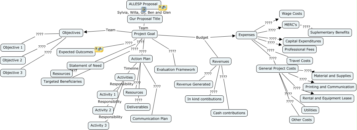 ALLESP Proposal, Revenues ???? Cash contributions, Expenses ???? Wage Costs, Revenues ???? Revenue Generated, General Project Costs ???? Printing and Communication, Expenses ???? Travel Costs, Activities Responsibility Activity 1, Project Goal Budget Revenues, General Project Costs ???? Other Costs, Revenues ???? In kind contibutions, Project Goal ???? Statement of Need