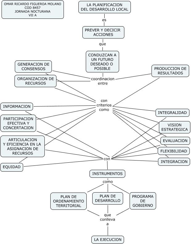 8457_GESTION_P_CAP2, INSTRUMENTOS como PLAN DE ORDENAMIENTO TERRITORIAL, ORGANIZACION DE RECURSOS con criterios como INFORMACION, LA PLANIFICACION DEL DESARROLLO LOCAL es PREVER Y DECICIR ACCIONES, PRODUCCION DE RESULTADOS con criterios como EVALUACION, ARTICULACION Y EFICIENCIA EN LA ASIGNACION DE RECURSOS con INSTRUMENTOS, GENERACION DE CONSENSOS con criterios como ARTICULACION Y EFICIENCIA EN LA ASIGNACION DE RECURSOS, INTEGRALIDAD con INSTRUMENTOS, GENERACION DE CONSENSOS con criterios como EVALUACION, ORGANIZACION DE RECURSOS con criterios como INTEGRALIDAD, PLAN DE ORDENAMIENTO TERRITORIAL que conlleva a LA EJECUCION