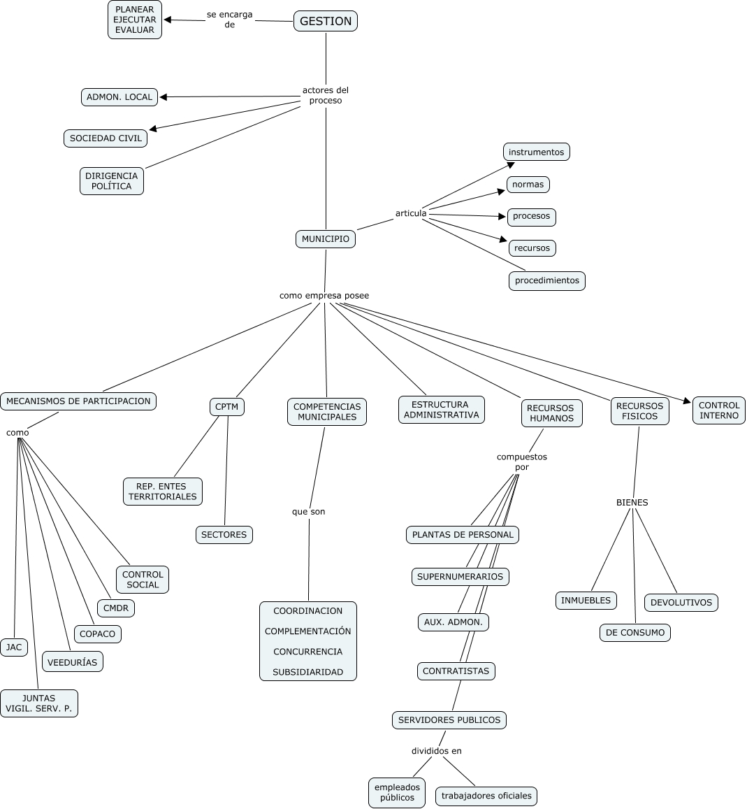 GESTIÓN, GESTION se encarga de PLANEAR EJECUTAR EVALUAR, RECURSOS FISICOS BIENES DEVOLUTIVOS, MUNICIPIO como empresa posee CPTM, MUNICIPIO como empresa posee RECURSOS FISICOS, GESTION actores del proceso DIRIGENCIA POLÍTICA, SERVIDORES PUBLICOS divididos en empleados públicos, GESTION actores del proceso SOCIEDAD CIVIL, MECANISMOS DE PARTICIPACION como COPACO, MECANISMOS DE PARTICIPACION como JUNTAS VIGIL. SERV. P., MUNICIPIO articula normas