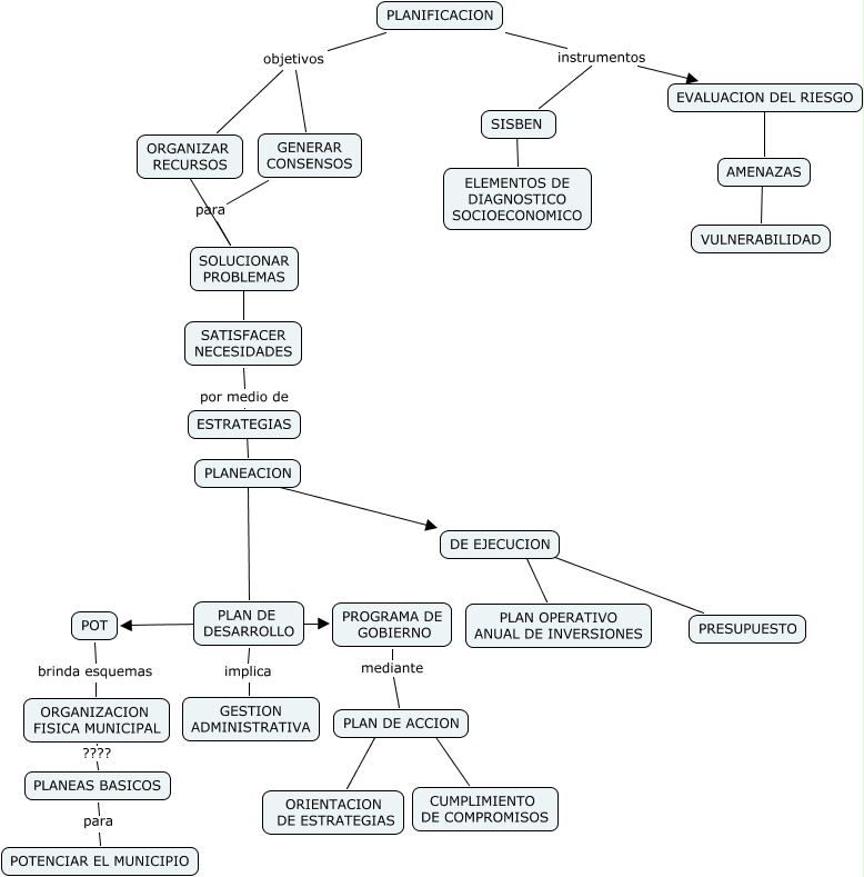 PLANIFICACION 7665, EVALUACION DEL RIESGO ???? AMENAZAS, DE EJECUCION ???? PLAN OPERATIVO ANUAL DE INVERSIONES, ORGANIZAR RECURSOS ???? SOLUCIONAR PROBLEMAS, POT brinda esquemas ORGANIZACION FISICA MUNICIPAL, PLAN DE DESARROLLO ???? POT, AMENAZAS ???? VULNERABILIDAD, PLAN DE DESARROLLO implica GESTION ADMINISTRATIVA, PLAN DE ACCION ???? CUMPLIMIENTO DE COMPROMISOS, SATISFACER NECESIDADES por medio de ESTRATEGIAS, PLANIFICACION instrumentos SISBEN