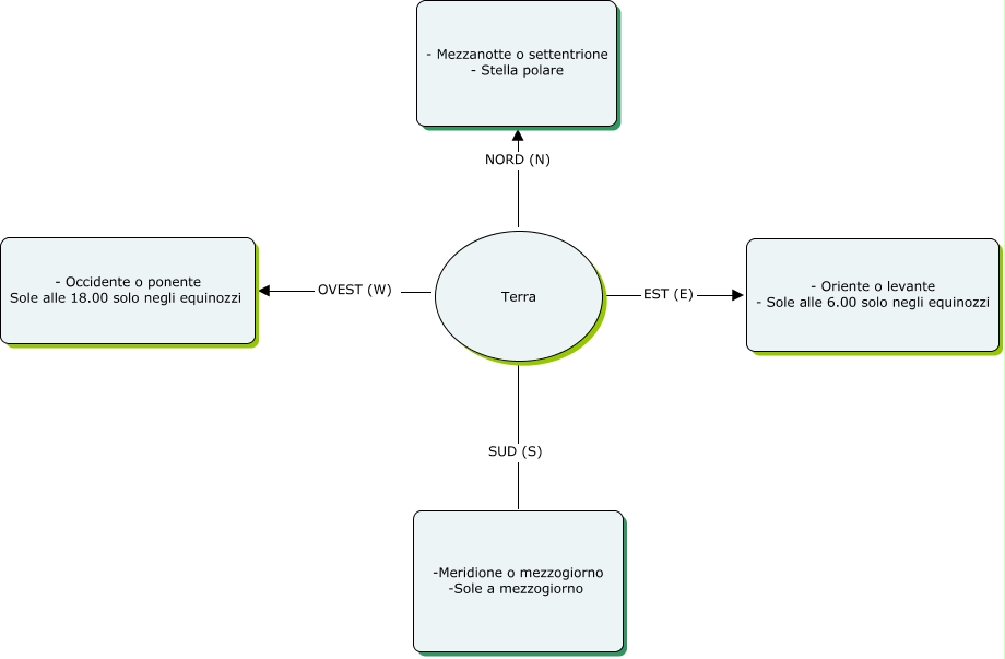 Punti cardinali, Terra NORD (N) - Mezzanotte o settentrione - Stella polare, Terra EST (E) - Oriente o levante - Sole alle 6.00 solo negli equinozzi, Terra OVEST (W) - Occidente o ponente Sole alle 18.00 solo negli equinozzi, Terra SUD (S) -Meridione o mezzogiorno -Sole a mezzogiorno