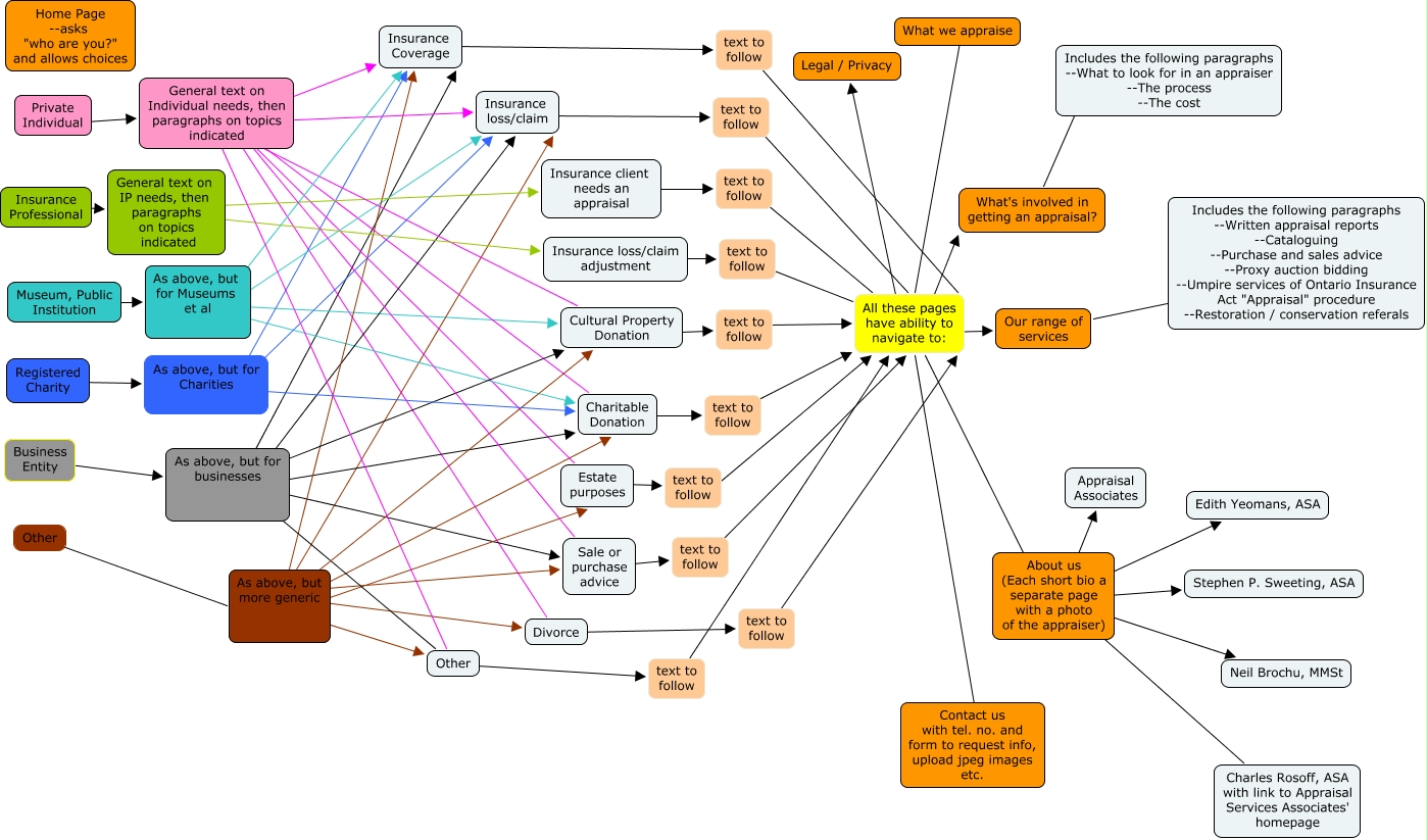 AA wireframe, All these pages have ability to navigate to: ???? Contact us with tel. no. and form to request info, upload jpeg images etc., All these pages have ability to navigate to: ???? Legal / Privacy, All these pages have ability to navigate to: ???? About us (Each short bio a separate page with a photo of the appraiser), As above, but more generic ???? Divorce, Private Individual ???? General text on Individual needs, then paragraphs on topics indicated, As above, but for businesses ???? Insurance Coverage, Cultural Property Donation ???? text to follow, General text on Individual needs, then paragraphs on topics indicated ???? Insurance loss/claim, General text on IP needs, then paragraphs on topics indicated ???? Insurance loss/claim adjustment, About us (Each short bio a separate page with a photo of the appraiser) ???? Edith Yeomans, ASA