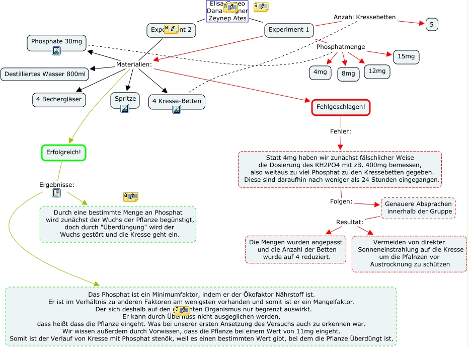Elisa und Co, Experiment 2 Materialien: Spritze, Genauere Absprachen innerhalb der Gruppe Resultat: Die Mengen wurden angepasst und die Anzahl der Betten wurde auf 4 reduziert., Experiment 1 Phosphatmenge 15mg, Experiment 2 Materialien: Erfolgreich!, Experiment 2 Materialien: Phosphate 30mg, Erfolgreich! Ergebnisse: Durch eine bestimmte Menge an Phosphat wird zunächst der Wuchs der Pflanze begünstigt, doch durch "Überdüngung" wird der Wuchs gestört und die Kresse geht ein., Experiment 2 Materialien: Fehlgeschlagen!, Experiment 2 Materialien: Destilliertes Wasser 800ml, Erfolgreich! Ergebnisse: Das Phosphat ist ein Minimumfaktor, indem er der Ökofaktor Nährstoff ist. Er ist im Verhältnis zu anderen Faktoren am wenigsten vorhanden und somit ist er ein Mangelfaktor. Der sich deshalb auf den gesamten Organismus nur begrenzt auswirkt. Er kann durch Überfluss nicht ausgeglichen werden, dass heißt dass die Pflanze eingeht. Was bei unserer ersten Ansetzung des Versuchs auch zu erkennen war. Wir wissen außerdem durch Vorwissen, dass die Pflanze bei einem Wert von 11mg eingeht. Somit ist der Verlauf von Kresse mit Phosphat stenök, weil es einen bestimmten Wert gibt, bei dem die Pflanze Überdüngt ist., Experiment 2 Materialien: 4 Kresse-Betten