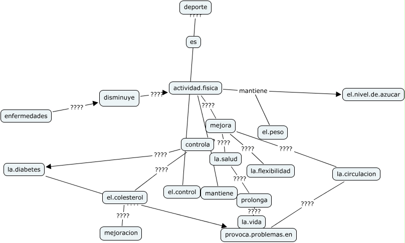 el.deporte, controla ???? la.diabetes, enfermedades ???? disminuye, mejora ???? la.circulacion, mejora ???? la.flexibilidad, el.control ???? deporte, prolonga ???? la.vida, la.circulacion ???? provoca.problemas.en, actividad.fisica ???? mejora, el.colesterol ???? mejoracion, actividad.fisica ???? mantiene