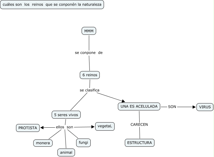 LA NATURALEZA, 5 seres vivos ellos son animal, 6 reinos se clasifica 5 seres vivos, 5 seres vivos ellos son fungi, 5 seres vivos ellos son vegetaL, 5 seres vivos ellos son PROTISTA, MMM se conpone de 6 reinos, UNA ES ACELULADA SON VIRUS, UNA ES ACELULADA CARECEN ESTRUCTURA, 6 reinos se clasifica UNA ES ACELULADA, 5 seres vivos ellos son monera