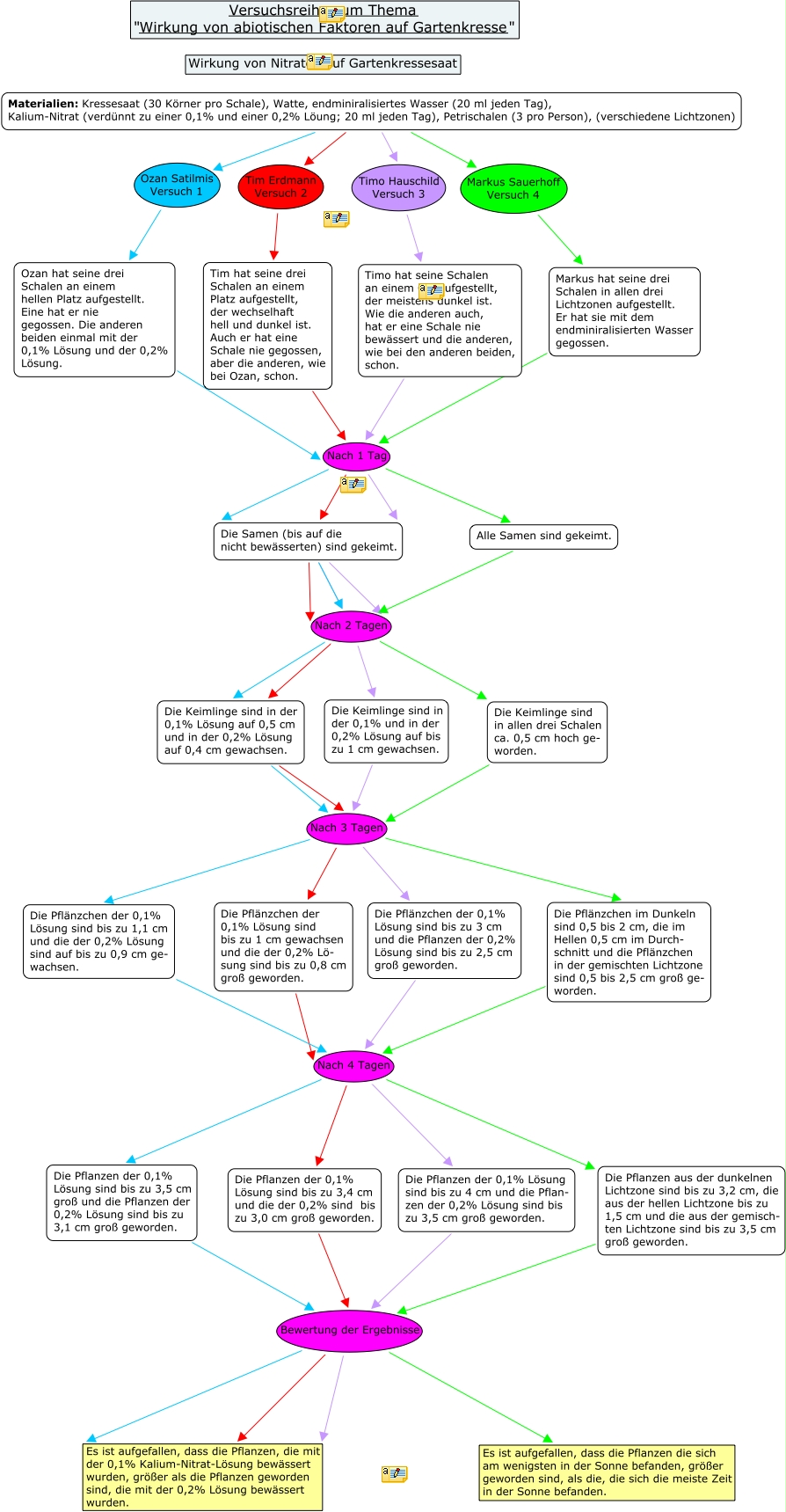 Kresseversuche Tim Timo Ozan Markus, Die Samen (bis auf die nicht bewässerten) sind gekeimt. Nach 2 Tagen Die Keimlinge sind in der 0,1% Lösung auf 0,5 cm und in der 0,2% Lösung auf 0,4 cm gewachsen., Die Keimlinge sind in allen drei Schalen ca. 0,5 cm hoch ge- worden. Nach 3 Tagen Die Pflänzchen im Dunkeln sind 0,5 bis 2 cm, die im Hellen 0,5 cm im Durch- schnitt und die Pflänzchen in der gemischten Lichtzone sind 0,5 bis 2,5 cm groß ge- worden., Timo hat seine Schalen an einem Ort aufgestellt, der meistens dunkel ist. Wie die anderen auch, hat er eine Schale nie bewässert und die anderen, wie bei den anderen beiden, schon. Nach 1 Tag Die Samen (bis auf die nicht bewässerten) sind gekeimt., Alle Samen sind gekeimt. Nach 2 Tagen Die Keimlinge sind in der 0,1% Lösung auf 0,5 cm und in der 0,2% Lösung auf 0,4 cm gewachsen., Die Pflänzchen im Dunkeln sind 0,5 bis 2 cm, die im Hellen 0,5 cm im Durch- schnitt und die Pflänzchen in der gemischten Lichtzone sind 0,5 bis 2,5 cm groß ge- worden. Nach 4 Tagen Die Pflanzen der 0,1% Lösung sind bis zu 3,4 cm und die der 0,2% sind bis zu 3,0 cm groß geworden., Die Pflänzchen der 0,1% Lösung sind bis zu 1 cm gewachsen und die der 0,2% Lö- sung sind bis zu 0,8 cm groß geworden. Nach 4 Tagen Die Pflanzen der 0,1% Lösung sind bis zu 4 cm und die Pflan- zen der 0,2% Lösung sind bis zu 3,5 cm groß geworden., Die Pflanzen der 0,1% Lösung sind bis zu 3,4 cm und die der 0,2% sind bis zu 3,0 cm groß geworden. Bewertung der Ergebnisse Es ist aufgefallen, dass die Pflanzen, die mit der 0,1% Kalium-Nitrat-Lösung bewässert wurden, größer als die Pflanzen geworden sind, die mit der 0,2% Lösung bewässert wurden., Die Samen (bis auf die nicht bewässerten) sind gekeimt. Nach 2 Tagen Die Keimlinge sind in der 0,1% Lösung auf 0,5 cm und in der 0,2% Lösung auf 0,4 cm gewachsen., Materialien: Kressesaat (30 Körner pro Schale), Watte, endminiralisiertes Wasser (20 ml jeden Tag), Kalium-Nitrat (verdünnt zu einer 0,1% und einer 0,2% Löung; 20 ml jeden Tag), Petrischalen (3 pro Person), (verschiedene Lichtzonen) Timo Hauschild Versuch 3 Timo hat seine Schalen an einem Ort aufgestellt, der meistens dunkel ist. Wie die anderen auch, hat er eine Schale nie bewässert und die anderen, wie bei den anderen beiden, schon., Die Keimlinge sind in der 0,1% Lösung auf 0,5 cm und in der 0,2% Lösung auf 0,4 cm gewachsen. Nach 3 Tagen Die Pflänzchen der 0,1% Lösung sind bis zu 1 cm gewachsen und die der 0,2% Lö- sung sind bis zu 0,8 cm groß geworden.