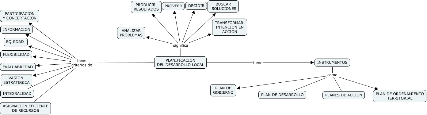 GESTION PUBLICA (CAP II), PLANIFICACION DEL DESARROLLO LOCAL significa ANALIZAR PROBLEMAS, PLANIFICACION DEL DESARROLLO LOCAL tiene criterios de INTEGRALIDAD, PLANIFICACION DEL DESARROLLO LOCAL tiene criterios de FLEXIBILIDAD, PLANIFICACION DEL DESARROLLO LOCAL significa TRANSFORMAR INTENCION EN ACCION, PLANIFICACION DEL DESARROLLO LOCAL tiene criterios de VASION ESTRATEGICA, INSTRUMENTOS como PLAN DE DESARROLLO, PLANIFICACION DEL DESARROLLO LOCAL tiene criterios de EVALUABILIDAD, PLANIFICACION DEL DESARROLLO LOCAL tiene criterios de ASIGNACION EFICIENTE DE RECURSOS, PLANIFICACION DEL DESARROLLO LOCAL tiene criterios de EQUIDAD, INSTRUMENTOS como PLAN DE GOBIERNO
