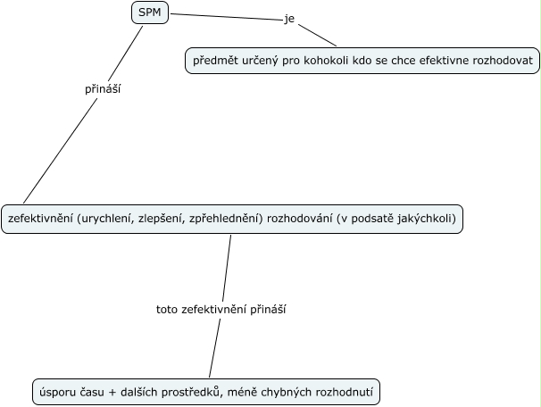 SPM1 Václav Šípek cv1, zefektivnění (urychlení, zlepšení, zpřehlednění) rozhodování (v podsatě jakýchkoli) toto zefektivnění přináší úsporu času + dalších prostředků, méně chybných rozhodnutí, SPM je předmět určený pro kohokoli kdo se chce efektivne rozhodovat, SPM přináší zefektivnění (urychlení, zlepšení, zpřehlednění) rozhodování (v podsatě jakýchkoli)