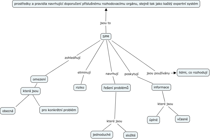 Libor Mitrovič_cv1, SPM jsou používány lidmi, co rozhodují, omezení ???? obecná, SPM poskytují informace, SPM navrhují řešení problémů, SPM zohledňují omezení, informace které jsou včasné, řešení problémů které jsou složité, SPM jsou to prostředky a pravidla navrhující doporučení příslušnému rozhodovacímu orgánu, stejně tak jako každý expertní systém, omezení ???? pro konkrétní problém, SPM eliminují riziko