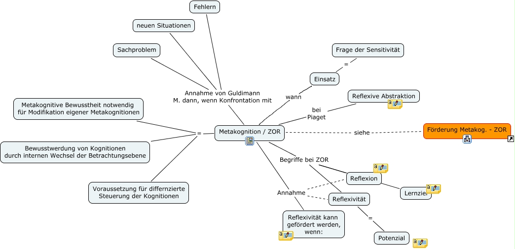 Metakognition, Metakognition / ZOR siehe Förderung Metakog. - ZOR, Metakognition / ZOR Annahme von Guldimann M. dann, wenn Konfrontation mit Fehlern, Metakognition / ZOR Begriffe bei ZOR Reflexivität, Metakognition / ZOR Annahme von Guldimann M. dann, wenn Konfrontation mit Sachproblem, Metakognition / ZOR Annahme Reflexion, Einsatz = Frage der Sensitivität, Metakognition / ZOR bei Piaget Reflexive Abstraktion, Metakognition / ZOR Annahme von Guldimann M. dann, wenn Konfrontation mit neuen Situationen, Metakognition / ZOR = Bewusstwerdung von Kognitionen durch internen Wechsel der Betrachtungsebene, Metakognition / ZOR Annahme Reflexivität kann gefördert werden, wenn: