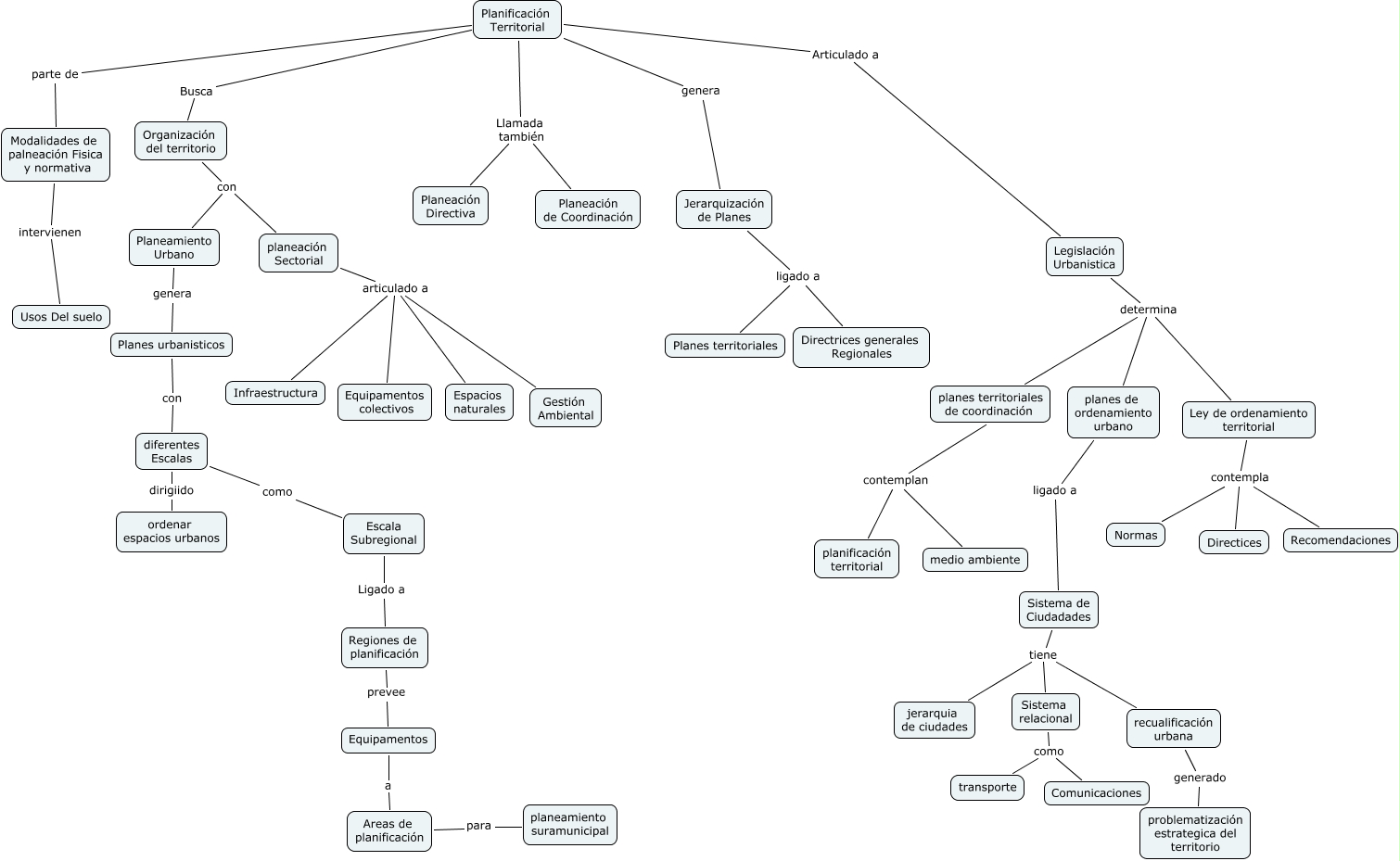 planeación territorial, Sistema relacional como Comunicaciones, planeación Sectorial articulado a Infraestructura, Planificación Territorial parte de Modalidades de palneación Fisica y normativa, planes territoriales de coordinación contemplan planificación territorial, Ley de ordenamiento territorial contempla Directices, Planificación Territorial Busca Organización del territorio, Regiones de planificación prevee Equipamentos, Sistema de Ciudadades tiene Sistema relacional, Planificación Territorial Llamada también Planeación de Coordinación, Sistema de Ciudadades tiene jerarquia de ciudades