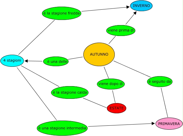 Autunno, AUTUNNO viene dopo di ESTATE, 4 stagioni è la stagione calda ESTATE, 4 stagioni è una stagione intermedia PRIMAVERA, AUTUNNO è seguito da PRIMAVERA, AUTUNNO è una delle 4 stagioni, 4 stagioni è la stagione fredda INVERNO, AUTUNNO viene prima di INVERNO