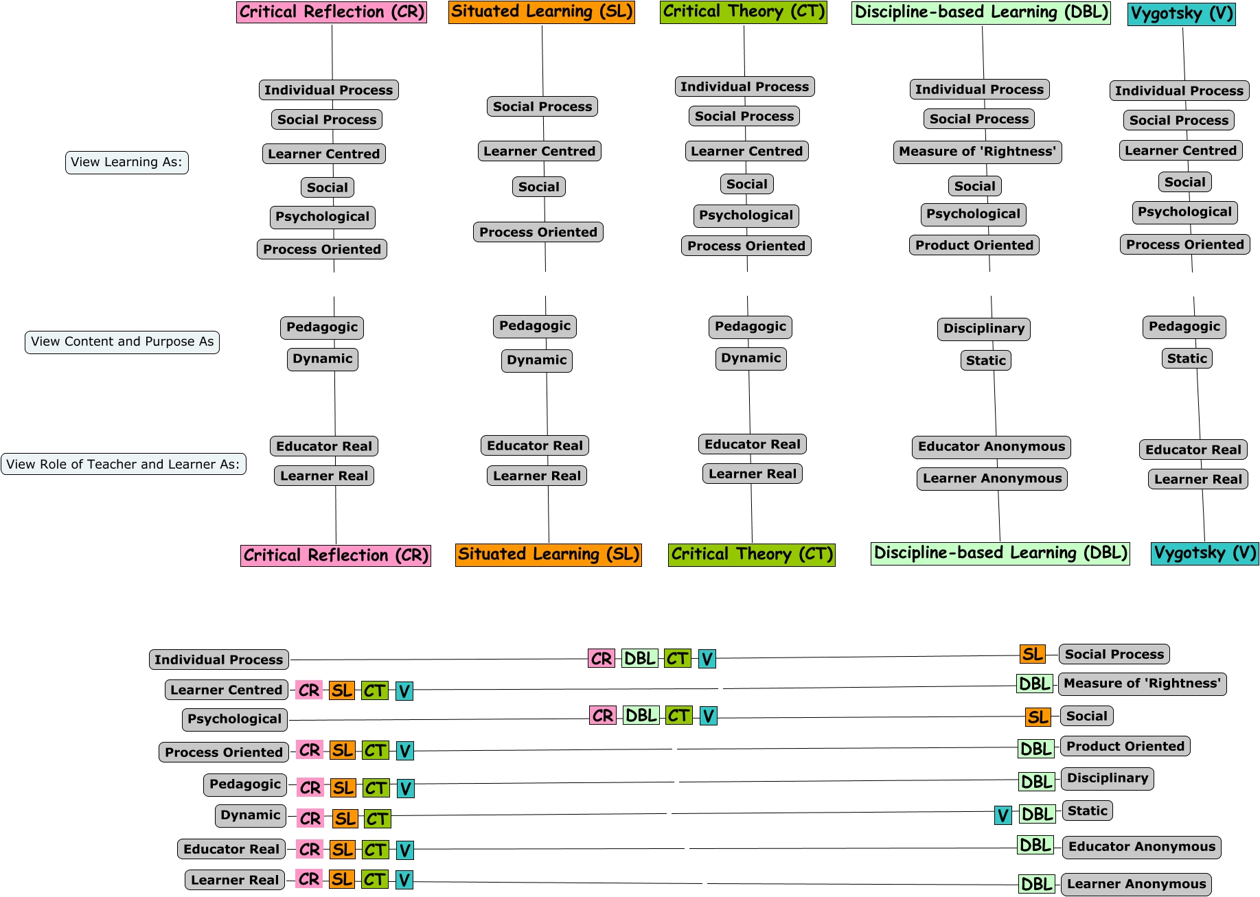 A3, Learner Real Learner Anonymous, Dynamic Static, Psychological Social, Critical Reflection (CR) Critical Reflection (CR), Process Oriented Product Oriented, Learner Centred Measure of 'Rightness', Pedagogic Disciplinary, Vygotsky (V) Vygotsky (V), Educator Real Educator Anonymous, Critical Theory (CT) Critical Theory (CT)