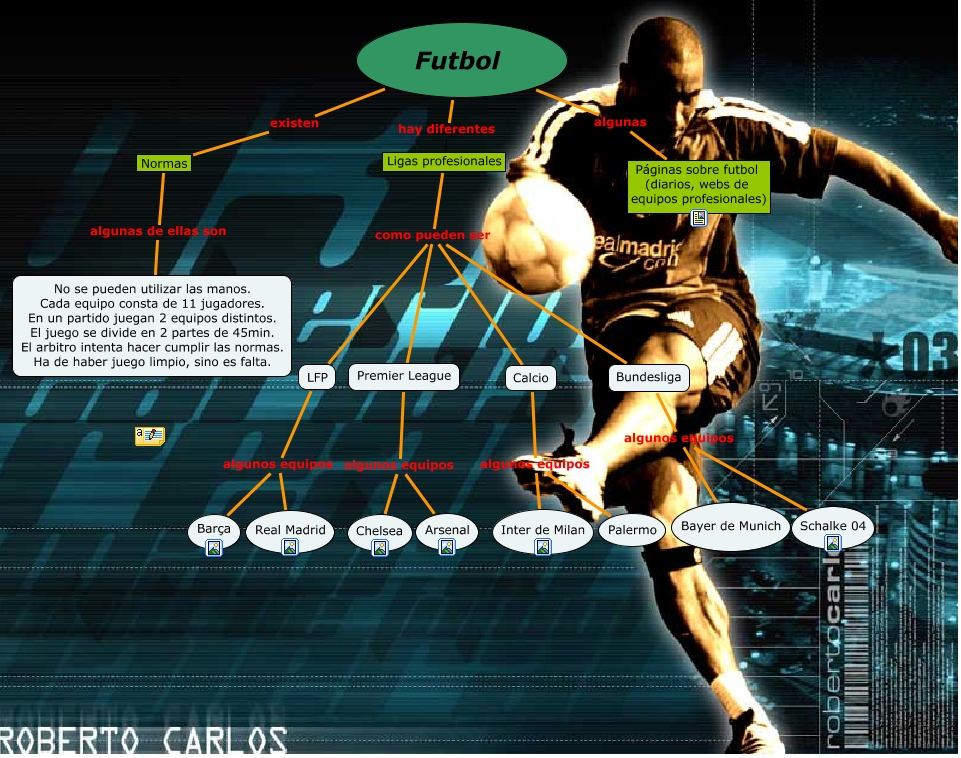 Cmap Futbol 1, Normas algunas de ellas son No se pueden utilizar las manos. Cada equipo consta de 11 jugadores. En un partido juegan 2 equipos distintos. El juego se divide en 2 partes de 45min. El arbitro intenta hacer cumplir las normas. Ha de haber juego limpio, sino es falta., Ligas profesionales como pueden ser LFP, Futbol existen Normas, LFP algunos equipos Barça, Futbol algunas Páginas sobre futbol (diarios, webs de equipos profesionales), Ligas profesionales como pueden ser Calcio, Calcio algunos equipos Palermo, LFP algunos equipos Real Madrid, Ligas profesionales como pueden ser Bundesliga, Futbol hay diferentes Ligas profesionales