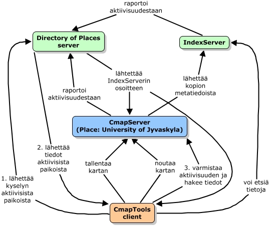 CmapToolsin verkkoarkkitehtuurista, Directory of Places server lähtettää IndexServerin osoitteen CmapTools client, CmapTools client tallentaa kartan CmapServer (Place: University of Jyvaskyla), CmapTools client voi etsiä tietoja IndexServer, IndexServer raportoi aktiivisuudestaan Directory of Places server, Directory of Places server 2. lähettää tiedot aktiivisista paikoista CmapTools client, CmapTools client noutaa kartan CmapServer (Place: University of Jyvaskyla), CmapTools client 1. lähettää kyselyn aktiivisista paikoista Directory of Places server, Directory of Places server lähtettää IndexServerin osoitteen CmapServer (Place: University of Jyvaskyla), CmapServer (Place: University of Jyvaskyla) raportoi aktiivisuudestaan Directory of Places server, CmapServer (Place: University of Jyvaskyla) lähettää kopion metatiedoista IndexServer