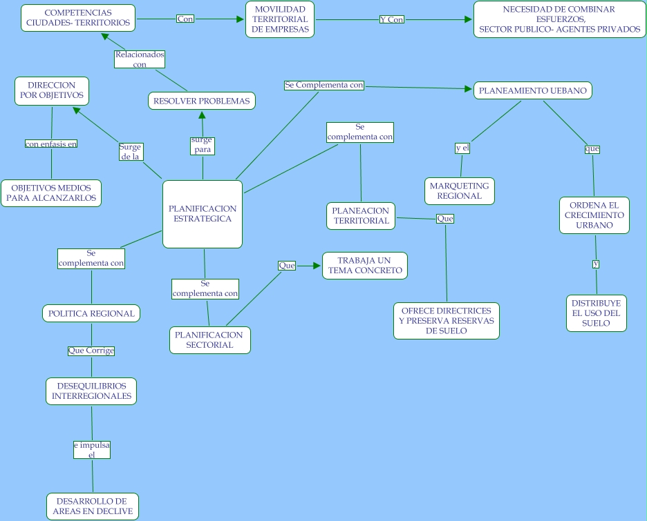 PLANEACION ESTRATEGICA, MOVILIDAD TERRITORIAL DE EMPRESAS Y Con NECESIDAD DE COMBINAR ESFUERZOS, SECTOR PUBLICO- AGENTES PRIVADOS, PLANIFICACION ESTRATEGICA Se complementa con PLANEACION TERRITORIAL, PLANIFICACION ESTRATEGICA surge para RESOLVER PROBLEMAS, DESEQUILIBRIOS INTERREGIONALES e impulsa el DESARROLLO DE AREAS EN DECLIVE, PLANIFICACION ESTRATEGICA Surge de la DIRECCION POR OBJETIVOS, PLANEAMIENTO UEBANO que ORDENA EL CRECIMIENTO URBANO, PLANIFICACION SECTORIAL Que TRABAJA UN TEMA CONCRETO, PLANIFICACION ESTRATEGICA Se complementa con POLITICA REGIONAL, PLANIFICACION ESTRATEGICA Se complementa con PLANIFICACION SECTORIAL, RESOLVER PROBLEMAS Relacionados con COMPETENCIAS CIUDADES- TERRITORIOS