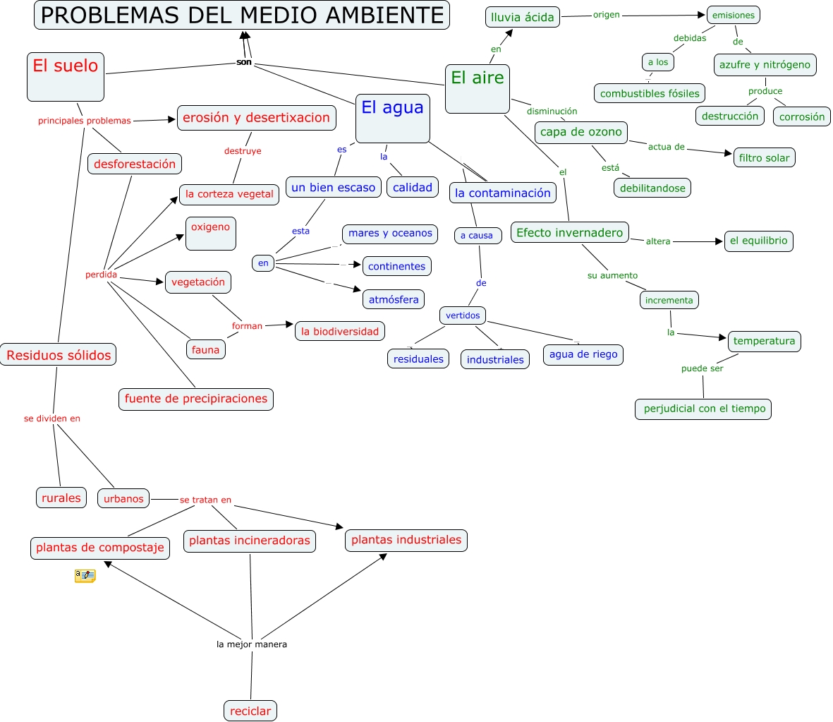 problemas del medio ambiente, El aire disminución capa de ozono, El aire el Efecto invernadero, incrementa la temperatura, en _ continentes, Residuos sólidos se dividen en rurales, lluvia ácida origen emisiones, azufre y nitrógeno produce destrucción, vertidos _ residuales, plantas incineradoras la mejor manera plantas de compostaje, vertidos _ industriales